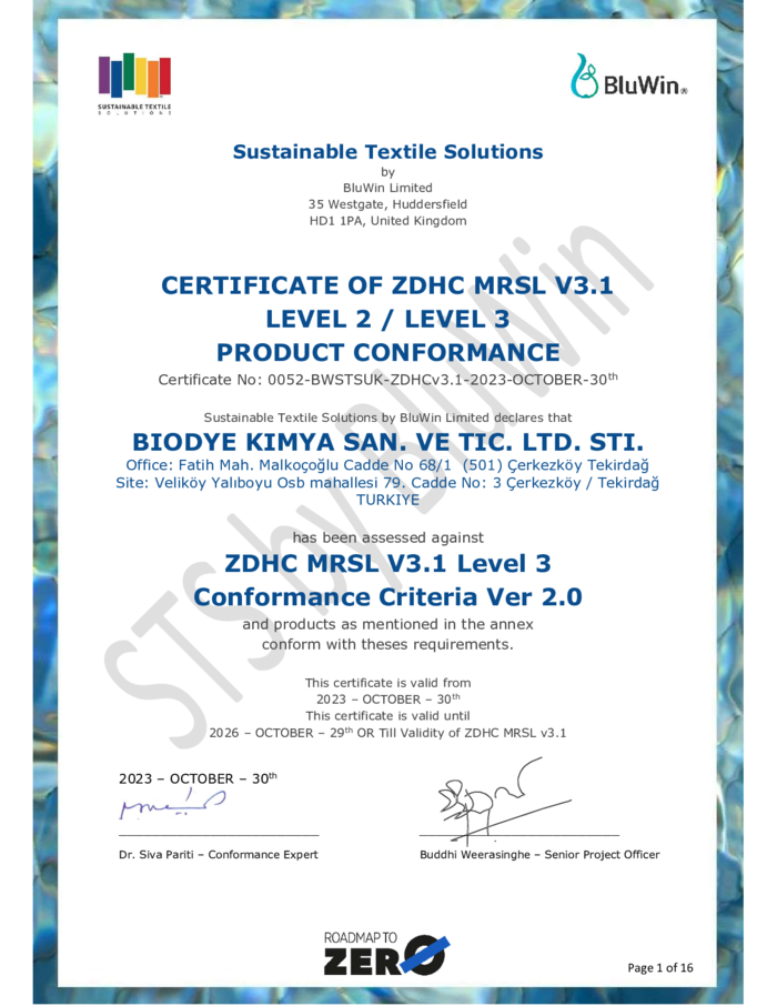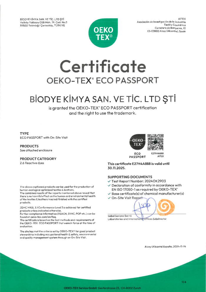 Kimyasal ürünlerde küresel ölçekte kabul gören güvenlik ve çevresel uygunluk gerekliliklerine uyum sağlamak amacıyla ZDHC MRSL V3.1 Ürün Uygunluk Sertifikası ve OEKO-TEX® ECO Passport belgelerine sahip olmaktan gurur duyuyoruz. Bu sertifikalar, ürünlerimizin insan sağlığına ve ekosisteme zarar verebilecek maddelerden arındırılmış olduğunu doğrularken, sürdürülebilir ve yenilikçi üretim hedeflerimizin güçlü bir göstergesi niteliğindedir. Tüm bu uluslararası sertifikalar, Biodye Kimya Sanayi’nin kalite, güvenlik ve çevre dostu kimyasal çözümler üretme konusundaki kararlılığını ve sektördeki liderliğini pekiştirmektedir.